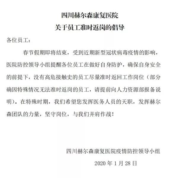 医院积极响应成都市卫健委、武侯区卫健局和四川省医院协会社会办医分会关于医、技、护自愿者的招募,四川赫尔森康复医院从高年资的副主任医师、副主任护师到青年的医护骨干纷纷志愿报名,目前已有医生 4 人、护士 2 人主动请战。我们不希望灾难的降临,但也绝不惧怕它的到来!赫尔森人不畏困难,勇往直前,充分展示出了“有德、有术、有情、有义”的医务工作者形象。保卫生命,抗击疫情,这是我们的决心,也是我们的信心。