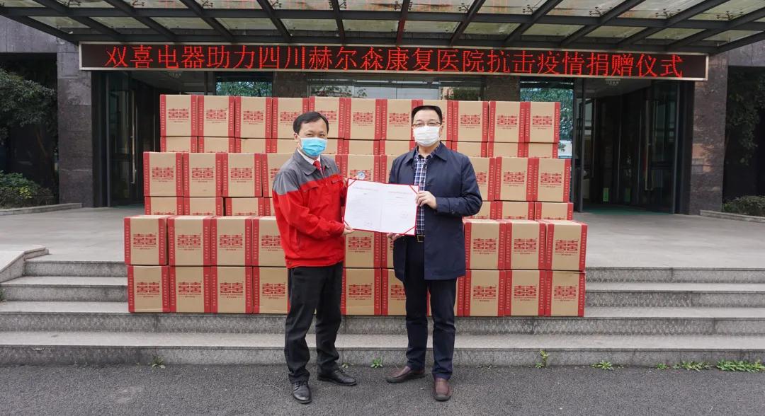 我院对双喜电器的爱心行动表示由衷的感谢和崇高的敬意!在致双喜电器的感谢信中写道:“疫情就是使命,防控就是责任。自新型冠状病毒感染的肺炎疫情以来,我院积极响应政府号召,主动担当社会责任,奋战在疫情抗击一线。在复工复产的疫情防控关键时期,贵司“雪中送炭”的无私行为,彰显了企业的责任担当和奉献精神,激励和感染我院继续履行好医疗机构的初心使命,在为广大群众服务的同时,全力确保医院医务人员、患者、康养老人的生命安全和身体健康。我们坚信在党中央的领导下,在贵司和社会各界爱心人士的大力支持下,我们一定能够打赢疫情防控阻击战。”