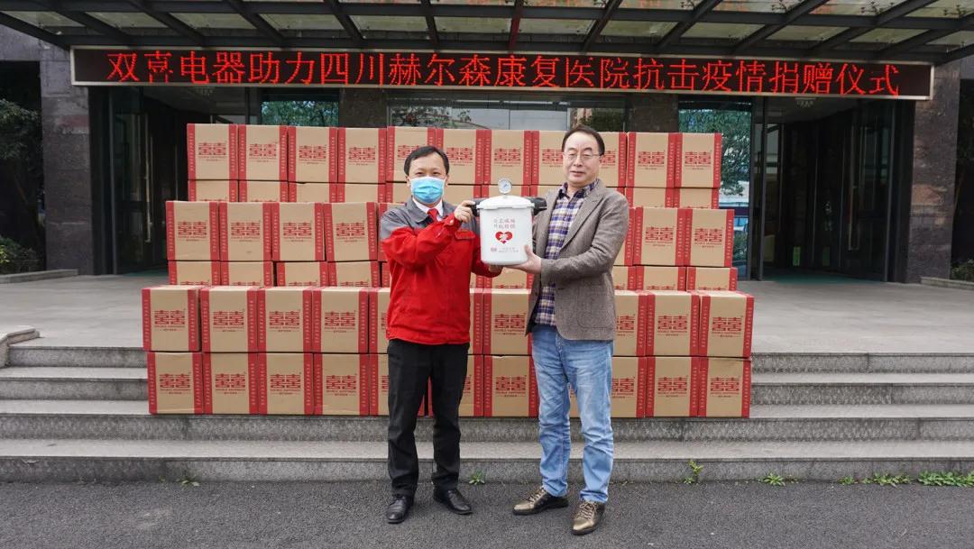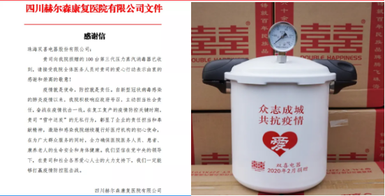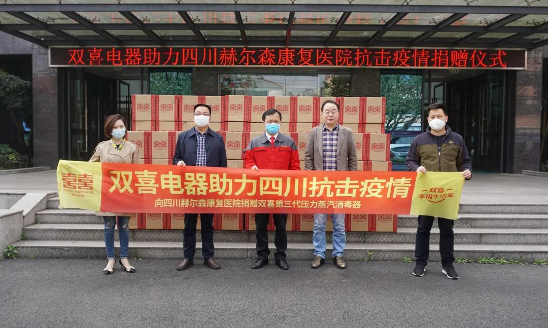 疫情凝聚千钧力,齐心协力抗疫情。4月8日,珠海双喜电器股份有限公司向四川赫尔森康复医院捐赠了100台第三代压力蒸汽消毒器,我院黄云峰院长,赵文乐副院长出席了捐赠仪式。