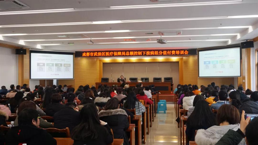 为更好地贯彻落实成都市医保局相关部署,推进成都市总额控制下按病组分值付费工作,2019年12月26日下午,武侯区医疗保障局特别邀请了成都市医疗保障事务中心邱桐老师开展“总额控制下按病组分值付费工作培训会”。会议于四川赫尔森康复医院学术厅举行,武侯区医疗保障局龙扬副局长、综合三科张智科长、医疗保障科孙书琦科长及武侯区各医疗机构代表约200人参与了本次培训。